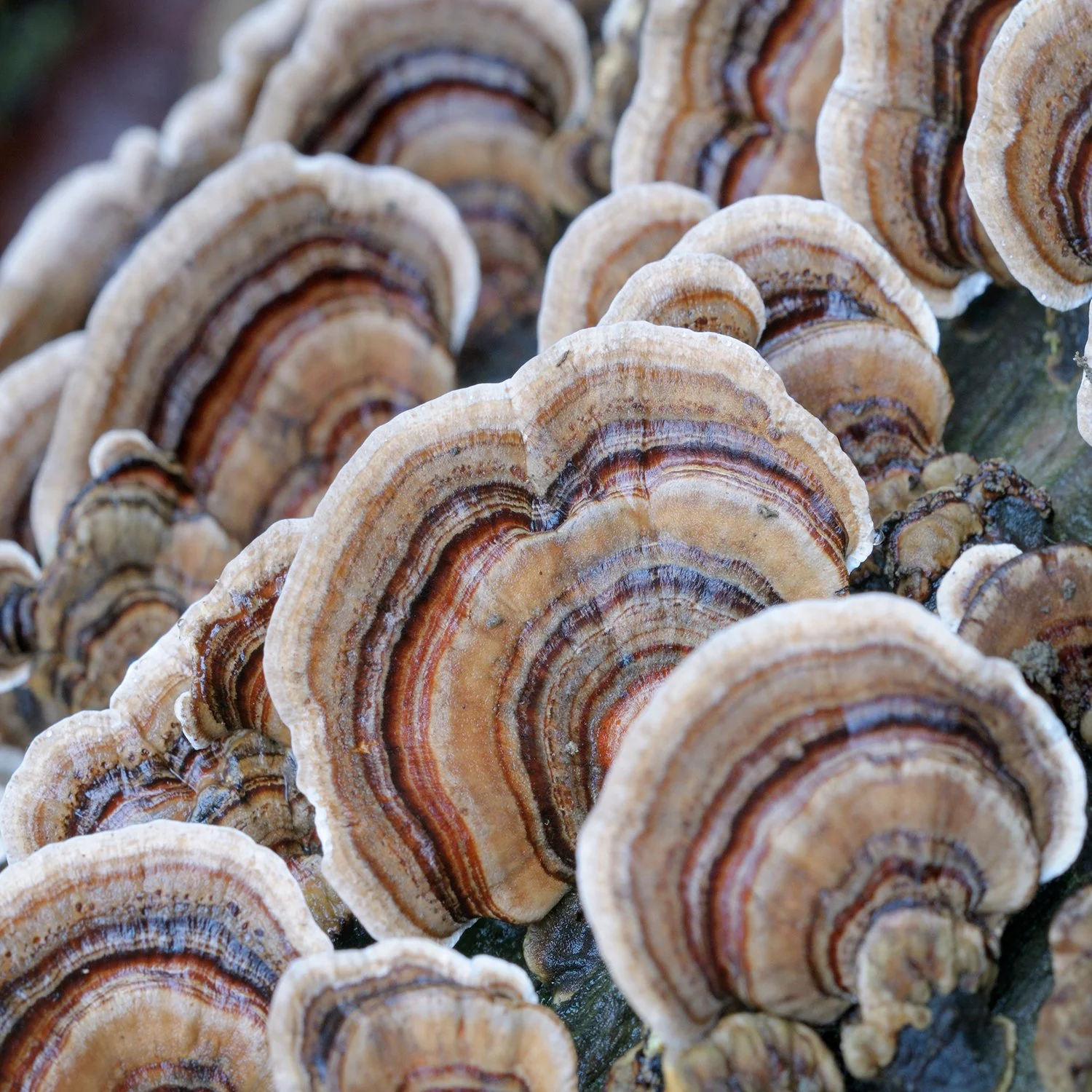 Reconnaissable à ses motifs en éventail, la queue de dinde est riche en polysaccharides étudiés pour leur interaction avec le système immunitaire.